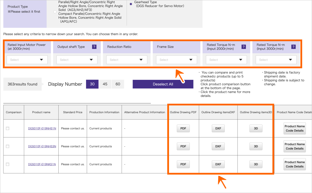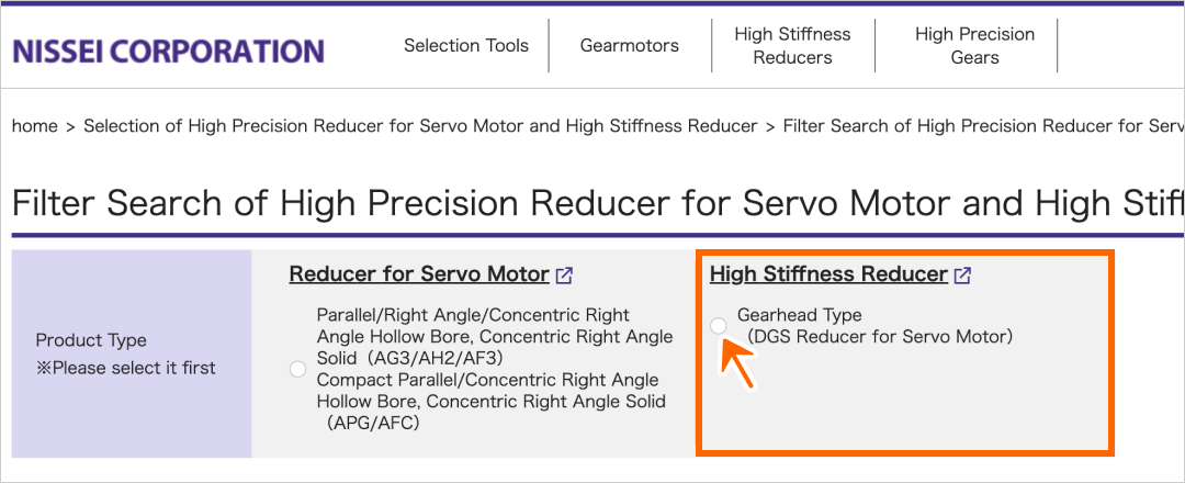 On page "Filter Search of High Precision Reducer for Servo Motor and High Stiffness Reducer" select the High Stiffness Reducer Gearhead Type.