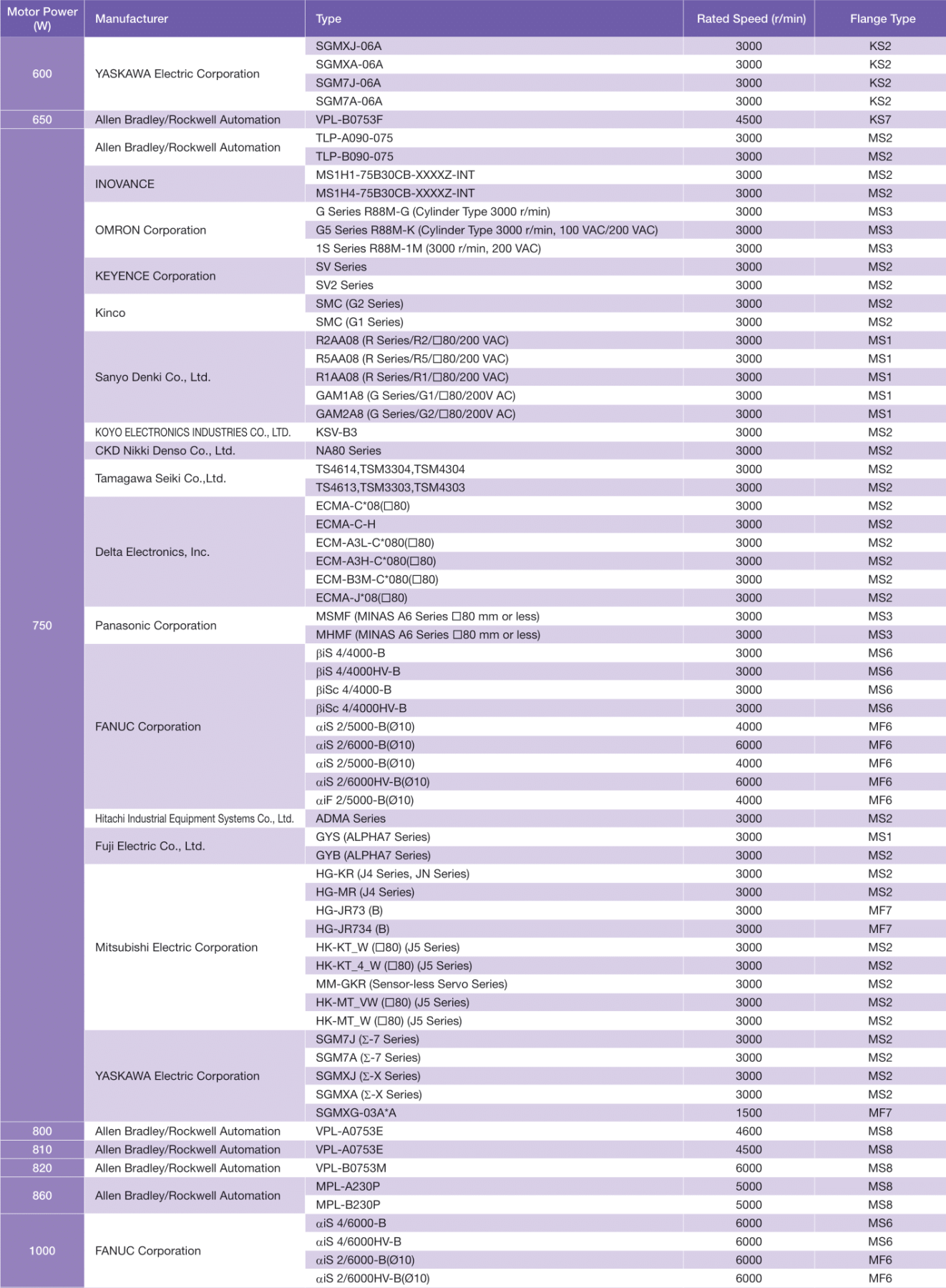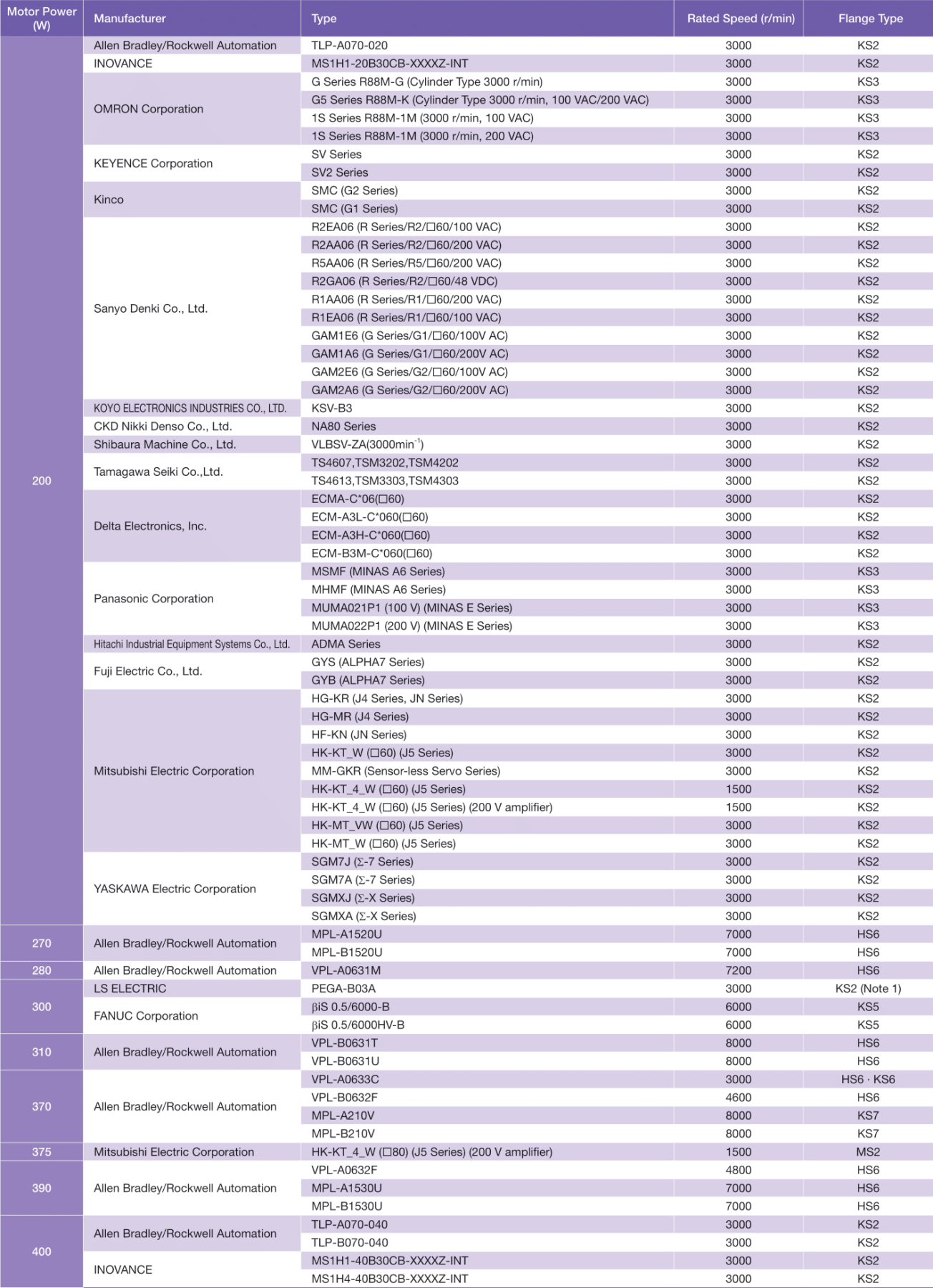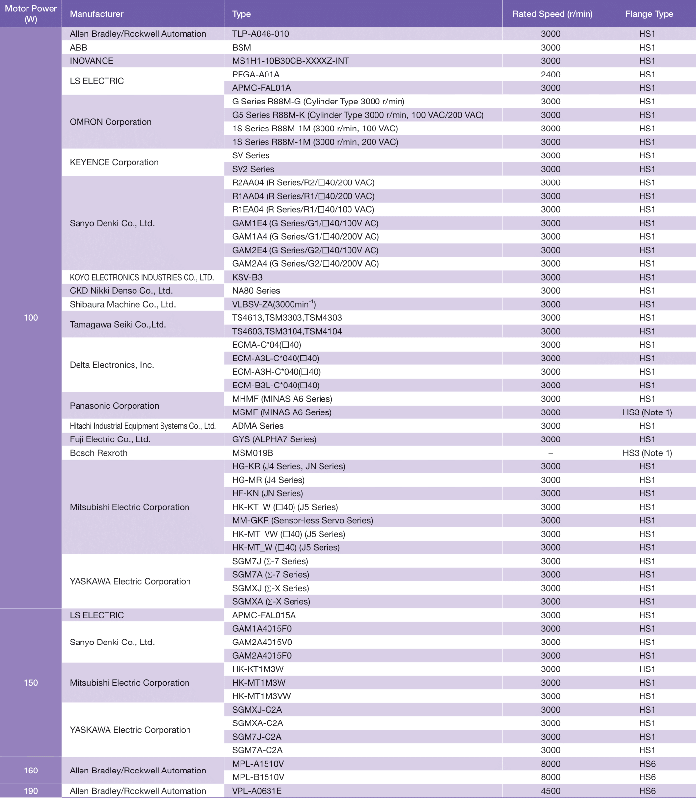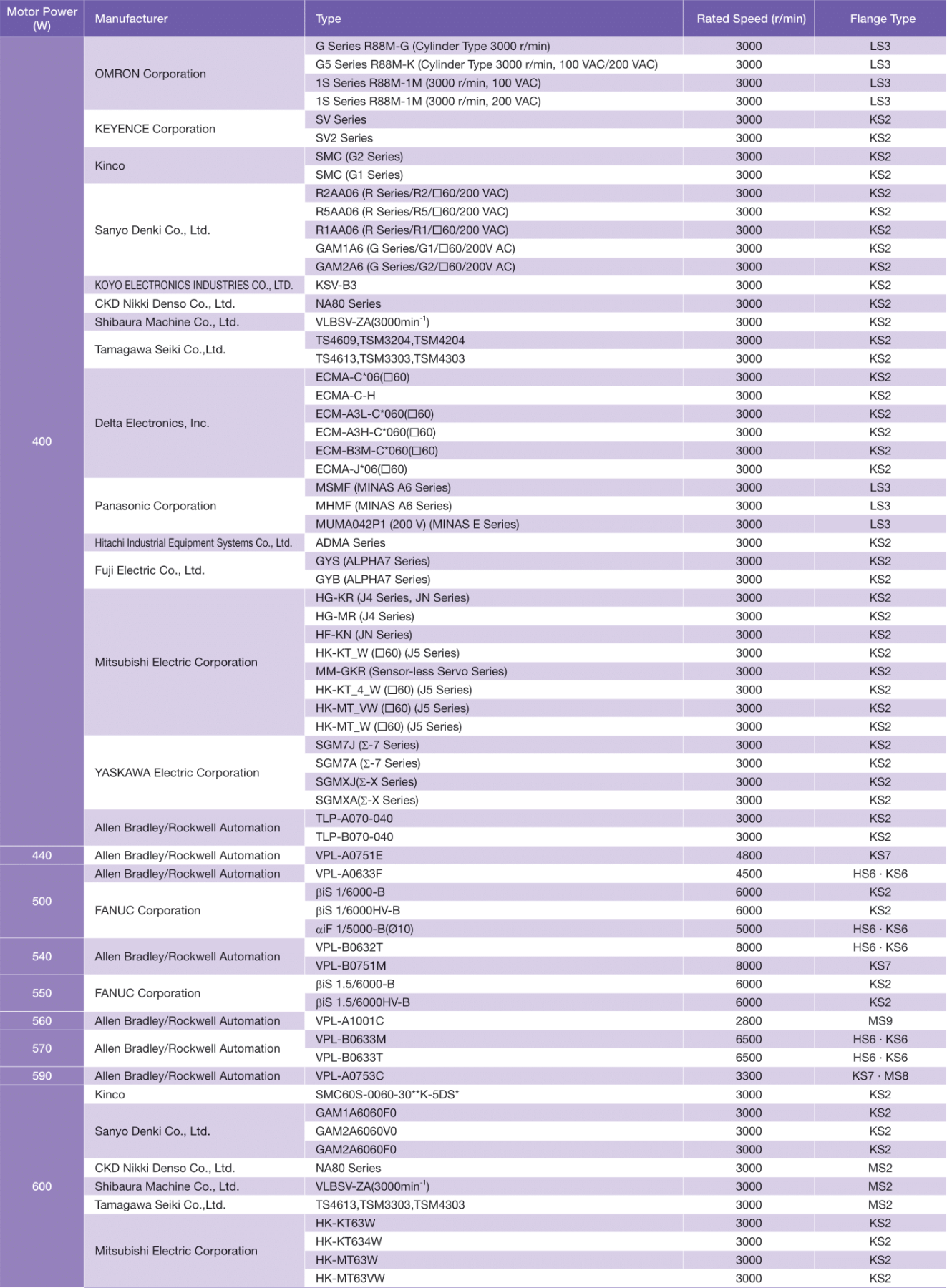 ● The tables show below representative examples as of October 2025. The specifications of servo motors are subject to change. When placing an order, be sure to check the dimensions of the servo motor flange you are going to use and the dimensions of the area in which our reducer for servo motor will be installed.