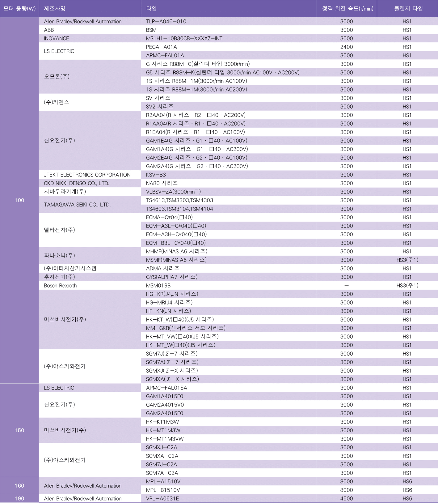 ● 아래 표는 2025년 10월 기준의 대표적인 제품 예입니다. 서보 모터의 사양은 변경될 수 있으므로, 주문 시에는 서보 모터 플랜지 치수, 당사 감속기 모터 장착부 치수를 반드시 확인하시기 바랍니다.